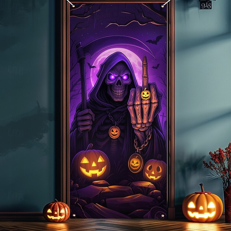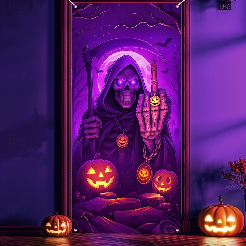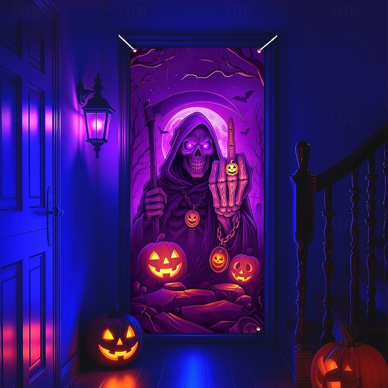 trending ! Halloween Door Cover Neon Pumpkin Head Grim Reaper Banner, Glowing Blacklight Entrance Decoration for Outdoor & Indoor 2025 Halloween Bedroom, Living Room, Bathroom