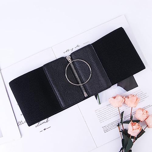 Vctitil Women Zipper Elastic Belt Waist Tightening Elastic Fashion Wide Waistband Tight Fitting Corset Dress Metal Circular PU Leather Belt