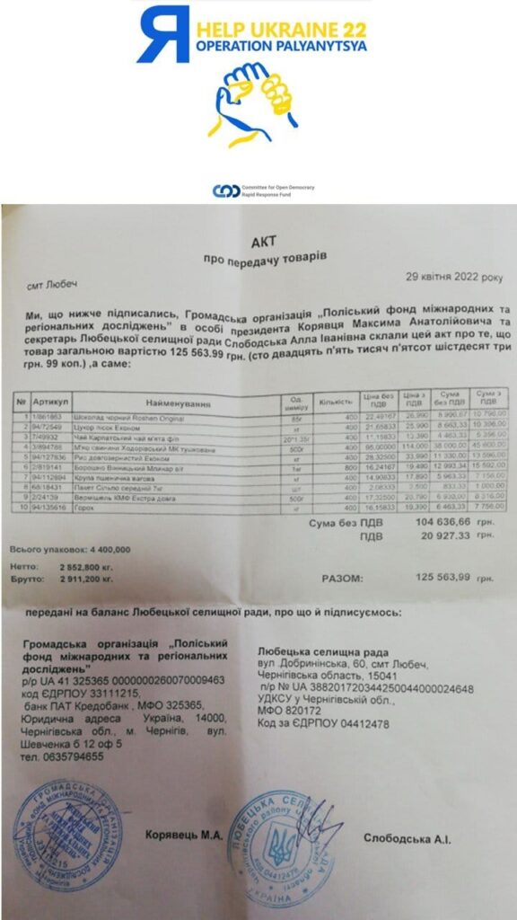 The staff of the Polissya Fund of International and Regional Research, thanks to Lisogor Elijah and Safronova, was able to provide humanitarian assistance in the form of product kits for 400 families of Lyubetsk TG.