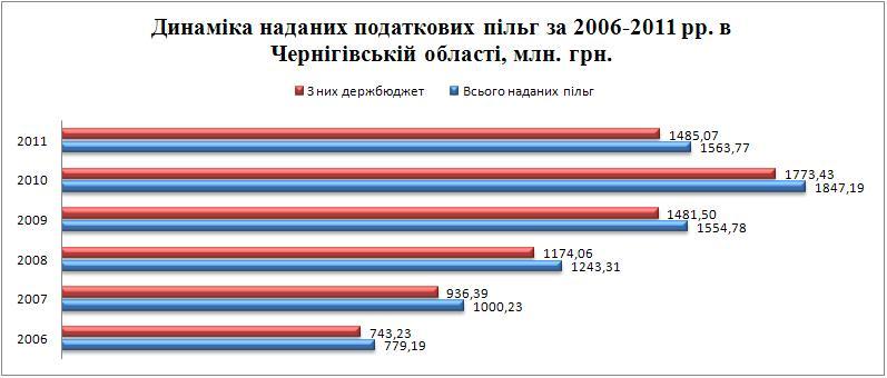 Since 2006 (Fig. 1), the total amounts of tax benefits obtained have increased by 2010 inclusive. The average growth rate of this figure was 25% each year. However, in 2011, the total amount of declared tax benefits decreased by UAH 283.4 million. or 16% (of which the state budget for UAH 288.4 million).