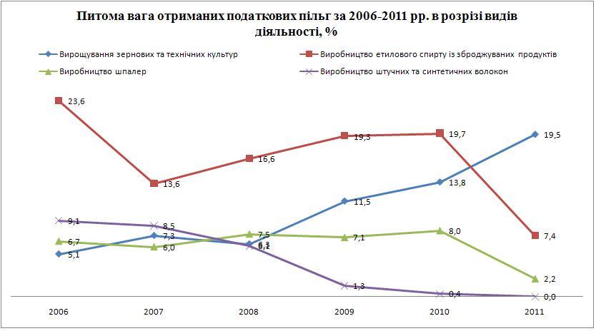 In 2006, the amount of tax benefits obtained for the production of cereals and industrial crops amounted to UAH 39.9 million. (The share of the total amount was 5.1%), with each subsequent year the share and the amount of benefits obtained increased and put: in 2007 UAH 73.5 million. (7.4%), in 2008 – UAH 78.7 million. (6.3%), in 2009 – UAH 17.9 million. (11.5%), in 2010 – UAH 254.7 million. (13.8%) and in 2011 – UAH 305.3 million. (19.5%). That is, the average growth rate for 2006-2011 was about 50% each year. The amounts of tax benefits received for this type of activity are increasing within 5 years.