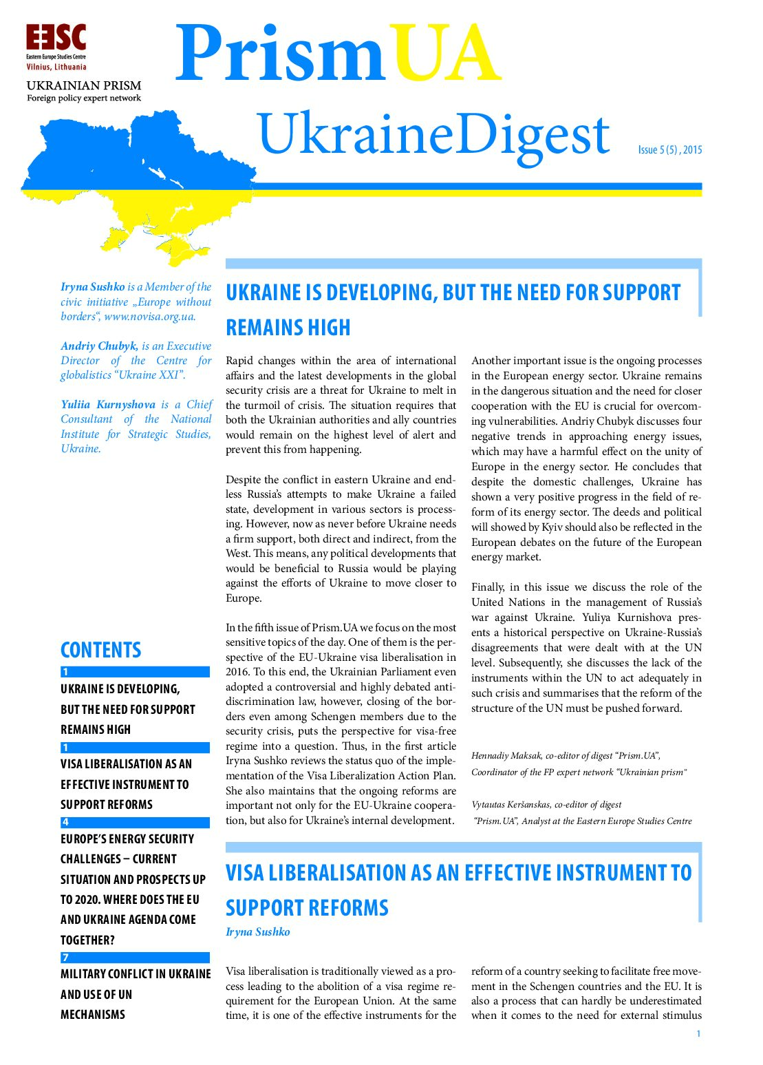 Rapid Changes with the Area of International Affairs and the Latest Developments in the Global Security Crisis Are a Threat for Ukraine to Melt in the Turmoil of Crisis. The situation requires that bot the Ukrainian authoritities and allycontries would remain with the Highest Level of Alert and Prevent this from HapPening. Despite the Conflict in Eastern UKraine and Endless Russia’s Attempts to Make Ukraine A Failed State, Development in Various Sectors. However, Now As Never Before Ukraine Needs A Firm Support, Both Direct and Indirect, From The West. This Means, Any Political Developments that would be Beneficial to Russia would be playing against the efforts of Ukraine to move Closer to Europe. In the fifth issue of prism.ua we focus on the most Sensitive Topics of the day. One of Them Is The Perspective of the Eu-Ukraine Visa Liberalization in 2016. To this End, the Ukrainian Parliament Even Even Adapted A Controversial and Highly Debated AntiDISCrimation Law, ovave. Schengen Members Due to the Security Crisis, Puts The Perspective for Visa-Freee Regime Into A Question. Thus, in the first article Iryna Sushko Reviews the Status quo of the Implementation of the Visa Liberalization Action Plan. She Also Maintains that the Ongoing Reforms Are Important Not Only for the EU-UKRAINE COOPERATION, But Also for Ukraine’s Internal Development. Another Important Issue Is The Ongoing Processes in the European Energy Sector. Ukraine Remains in the Dangerous Situation and the NEED FOR CLOSER COOPERATION WITH the EU Is Crucial for Overcoming Vulnerabilites. Andriy Chubyk Discusses Four Negative Trends in Approaching Energy Issues, Which May have a Harmful Effect on the unity of Europe in the energy sector. He Concludes that despite the domestic challenges, Ukraine Has Shown a very Positive Progress in the Field of Reform of ITS Energy Sector. The Deeds and Political Will Showed by Kyiv Should Also Be Reflected in the European Debates on the Future of the European Energy Market. Finally, in this issue we discusses the role of the United Nations in the Management of Russia’s War Against Ukraine. Yuliya Kurnishova Presents A Historical Perspective on Ukraine-Russia’s Disagreements That Were Dealt with The Unan. Subsequently, she discusses the Lack of the Instruments with the fact of the act adequately in such crisis and summarises that reform of the STRUCTURE OF THE UN MUST BE PUSHED FORWARD.