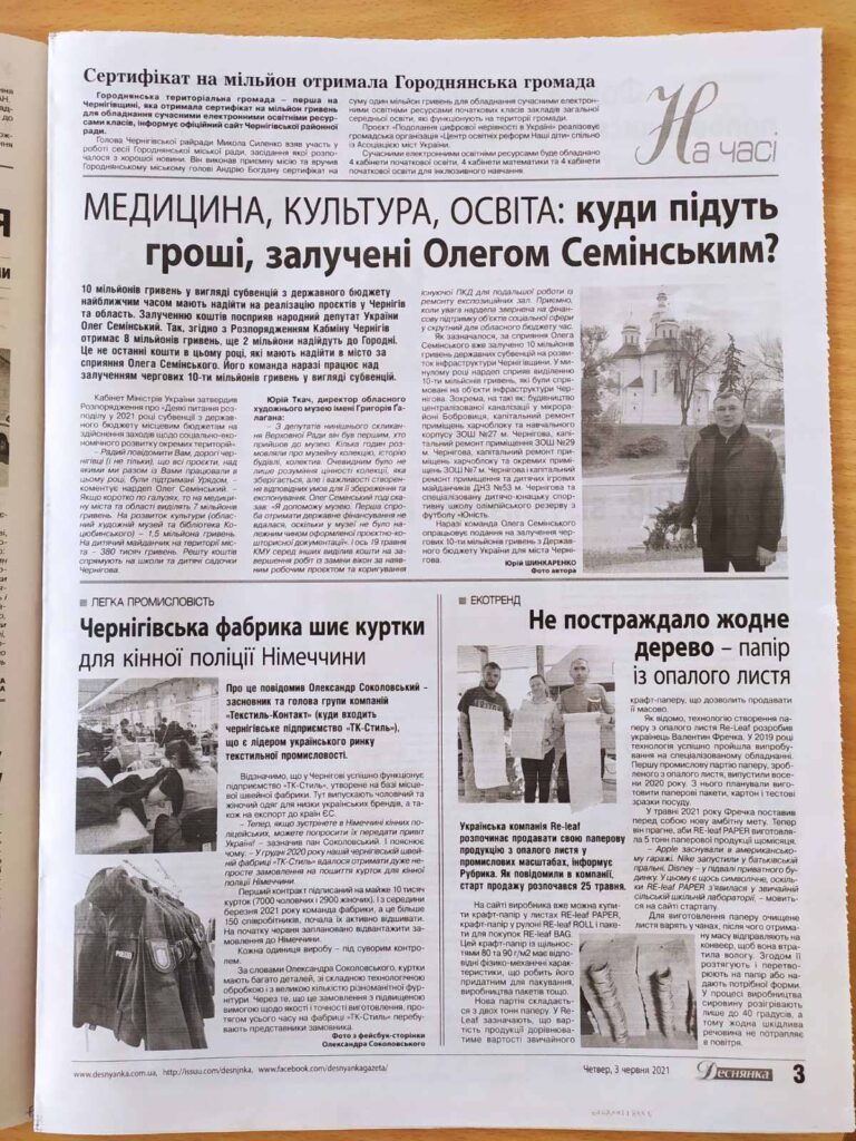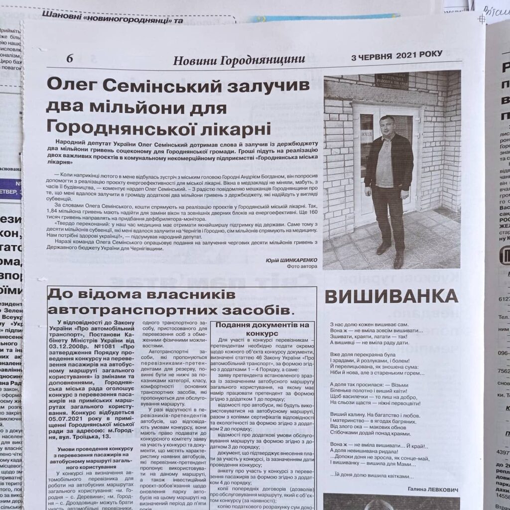 Окрім субвенції на соціально-економічний розвиток, депутат на своїй сторінці оприлюднив інформацію про «інтернет-субвенцію», а саме, що 10 громад його округу – Бобровицька, Ладанська, Линовицька, Малодівицька, Сухополов’янська, Яблунівська, Деснянська, Козелецька, Кіптівська та Остерська отримають «інтернет-субвенцію» на реалізацію проєктів із розбудови мережі Інтернет у своїх селах. Загальна сума фінансування – понад 10,5 млн грн. Народний обранець зауважує про важливість цього проєкту і цілковиту підтримку Мінцифри в реалізації ініціативи.
