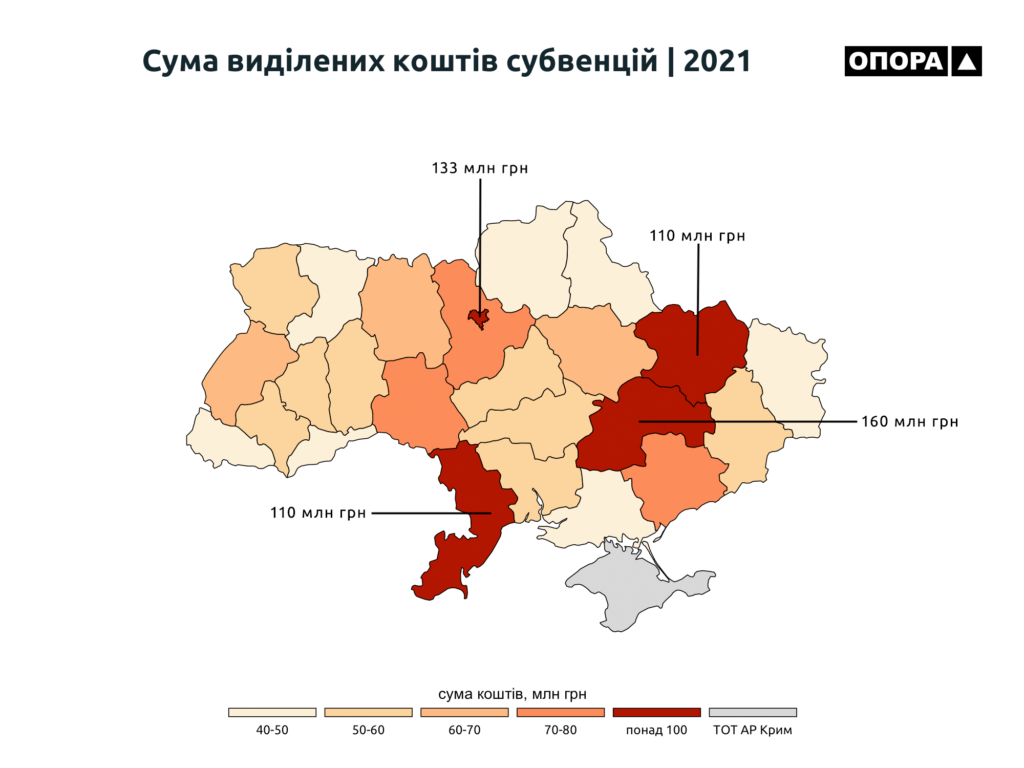 На національному рівні у 2021 році 31 округам (15%) не виділили коштів взагалі. Попереднього року даний показник був на рівні 20% або 40 виборчих округів. У Чернігівській області всі шість округів отримали додаткове фінансування у формі субвенції.