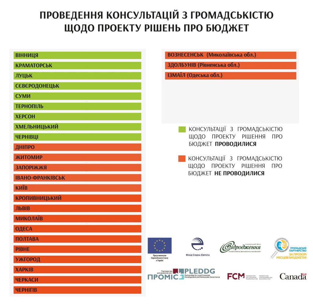 Найгірша ситуація зафіксована в частині проведення органами влади консультацій із громадянами (“бюджетних слухань”) щодо проекту рішення про бюджет після його оприлюднення, що є важливою практикою залучення громадян до підготовки головного фінансового документа. Так в 17 містах такі консультації з громадянами взагалі не проводились: Київ, Дніпро, Житомир, Запоріжжя, Івано-Франківськ, Кропивницький, Львів, Миколаїв, Одеса, Полтава, Рівне, Ужгород, Харків, Черкаси, Чернігів, Здолбунів, Ізмаїл.