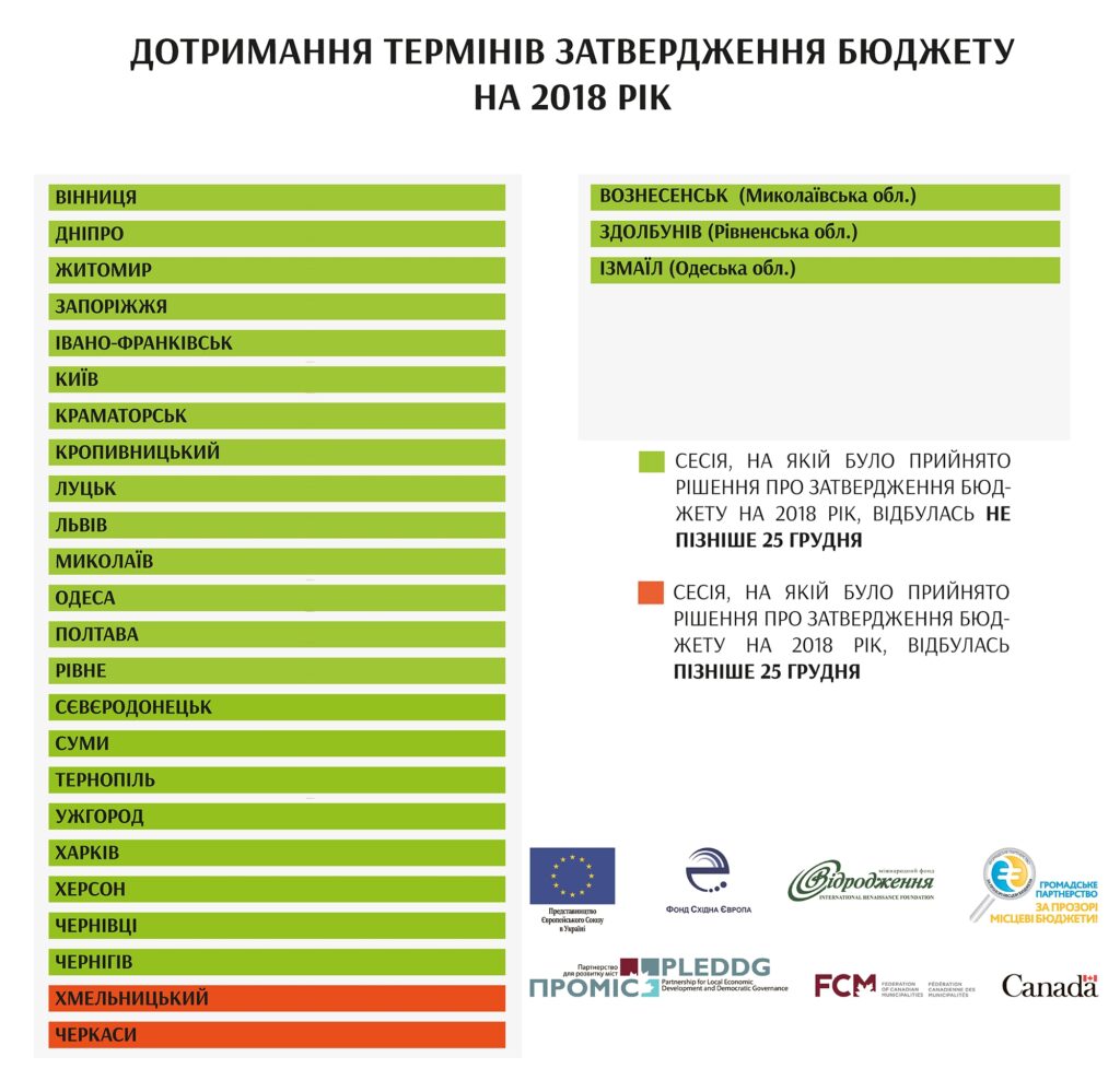 Щодо інших висновків. Попри незалежність прийняття місцевих бюджетів від державного, та зазначений чіткий термін в ст. 77 Бюджетного кодексу, станом на 25 грудня, Хмельницький та Черкаси все ще не мали прийнятих бюджетів на 2018 рік, при чому в Хмельницькому, здається, це стандартна ситуація, адже бюджет-2017 в цьому місті також був прийнятий із запізненням.