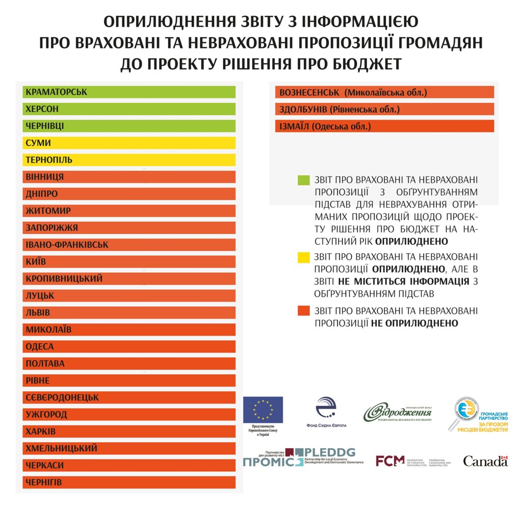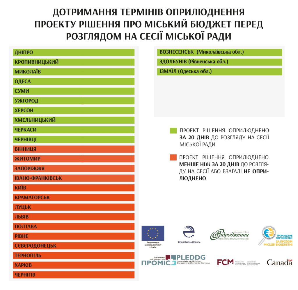 Попри чітку вимогу чинного законодавства, що кваліфікує рішення про бюджет як нормативно-правовий акт та поширення на нього норми про оприлюднення за 20 робочих днів до дати розгляду з метою прийняття, цієї норми дотрималися лише 13 міст. В Києві, Вінниці, Житомирі, Запоріжжі, Івано-Франківську, Краматорську, Луцьку, Львові, Полтаві, Рівному, Сєвєродонецьку, Тернополі, Чернігові міські ради оприлюднили проект рішення менш як за 20 днів. Взагалі не був оприлюднений проект бюджету у Харкові.