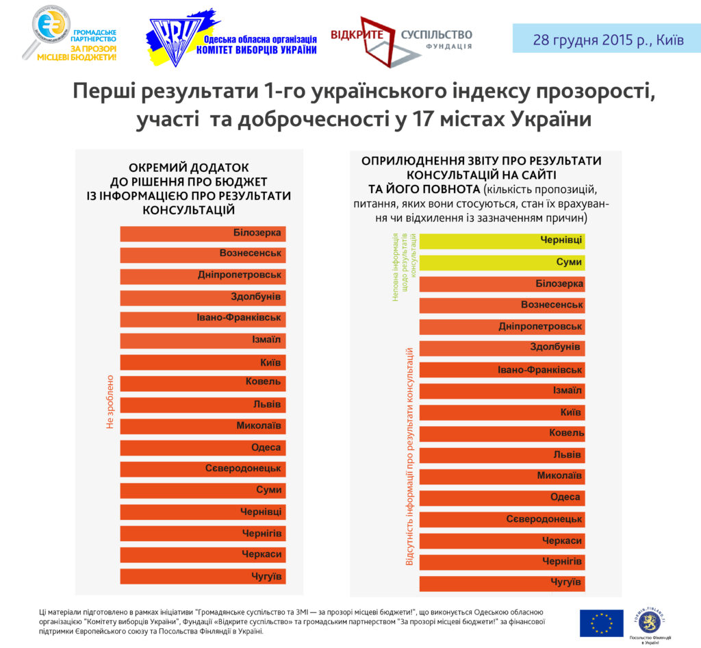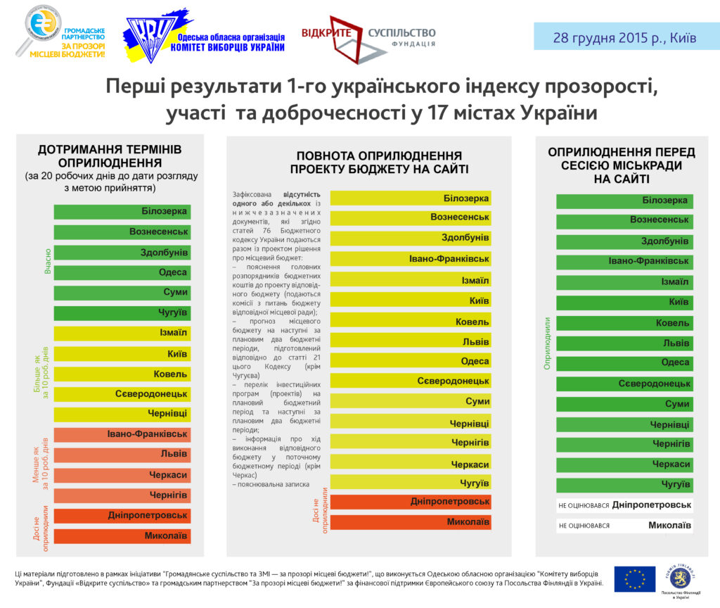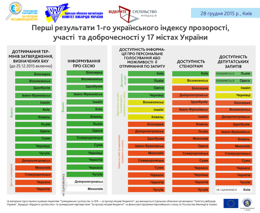 Попри чітку вимогу чинного законодавства, що кваліфікує рішення про бюджет, як нормативно-правовий акт, та поширення на нього норми про оприлюднення за 20 робочих днів до дати розгляду з метою прийняття, цієї норми дотрималися лише 5 міст (Одеса, Здолбунів, Вознесенськ, Чугуїв, Білозерка). В Києві, Чернівцях, Сумах, Ковелі, Сєверодонецьку та Ізмаїлі оприлюднили проект рішення менш як за 20, але більше як за 10 робочих днів. А в 4-х містах (Львів, Черкаси, Чернігів, Івано-Франківськ) проект рішення оприлюднили менш як за 10 робочих днів. На час презентації не оприлюднені проекти бюджетів були у Дніпропетровську та Миколаєві.