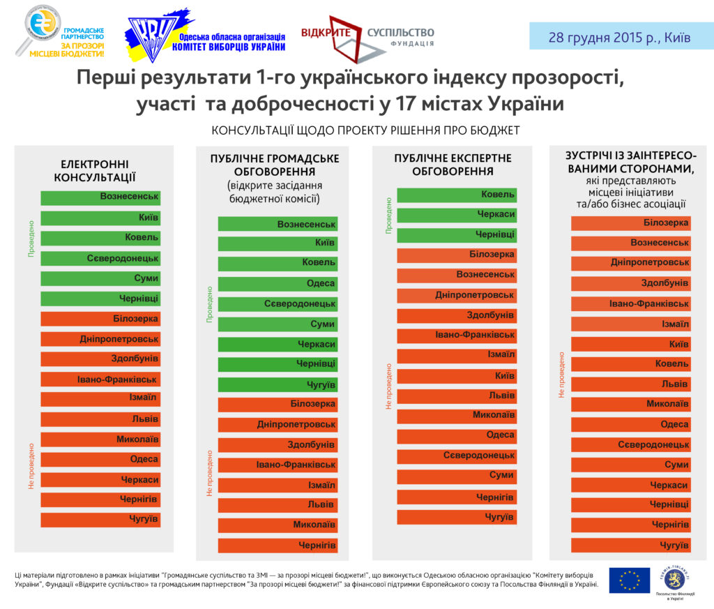 Публічне громадське обговорення (відкрите засідання бюджетної комісії) було проведено в 9 містах (Київ, Одеса, Чернівці, Черкаси, Суми, Вознесенськ, Ковель, Сєверодонецьк, Чугуїв). Не проводилися публічне громадське обговорення у 8 містах (Львів, Дніпропетровськ, Миколаїв, Чернігів, Здолбунів, Івано-Франківськ, Ізмаїл, Білозерка).