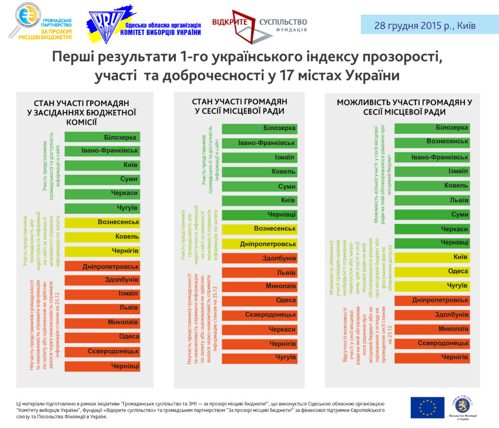 28 грудня в Києві оприлюдненні перші проміжні результати 1-го українського Індексу прозорості, участі та доброчесності (Індекс ПУД) на основі аналізу ситуації із оприлюдненням та затвердженням місцевих бюджетів у 17 містах України . Моніторинг здійснювався на основіметодології Індексу ПУД, що була розроблена Фундацією «Відкрите суспільство». Проект реалізується Одеською організацією Комітету виборців України та Фундацією «Відкрите суспільство» разом із партнерами у 15 містах в рамках громадського партнерства «За прозорі місцеві бюджети!». Місцевим партнером виступає Поліський фонд міжнародних та регіональних досліджень.