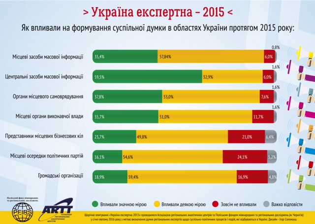 Найбільший вплив на формування суспільної думки в Україні протягом 2015 року мали центральні засоби масової інформації (59,5%), Верховна Рада України (35,0%) та Блок Петра Порошенка «Солідарність» (30,9%). Жодним чином не впливали на масову свідомість політична сила «Народний фронт» (47,0%), місцеві осередки політичних партій (24,1%) та Адміністрація Президента України (16,5%).