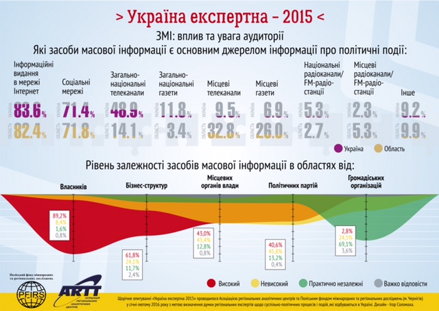 Також під час національного експертного опитування виявилось, що лідером серед засобів масової інформації, які були основним джерелом інформації про політичні події як на загальнодержавному (83,6%), так і на регіональному (82,4%) рівні, були інформаційні видання в мережі Інтернет. Друге місце посідають соціальні мережі – 71,4% та 71,8% відповідно. Такі тенденції, вочевидь, пояснюються високим рівнем (89,2%) залежності засобів масової інформації від їхніх власників.