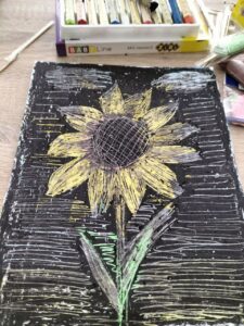 Основне завдання арт терапії полягає в тому, щоб за допомогою символів, образів, метафор, через які інформація кодується на несвідомому рівні психіки, «витягнути» певну проблему, що захована за ними, спроєктувати її на свідомий рівень та пропрацювати пов’язані з нею емоції та переживання і звільнитися від застарілих чи витіснених емоцій. На цьому етапі заняття працювали з восковою пастеллю, повітряним пластиліном, і для більшості учасниць це був перший досвід роботи з такими матеріалами.